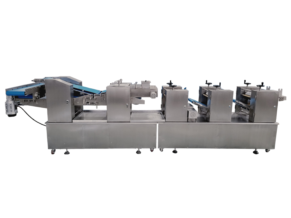 制皮機為臥式成型機,通過傳送機構將各道軋輥線速度比合理分配,實現從投料到制皮成型自動化生產。適用于餃子皮、餛飩皮、燒麥皮、蒸餃皮、以及燙面類面皮成型。